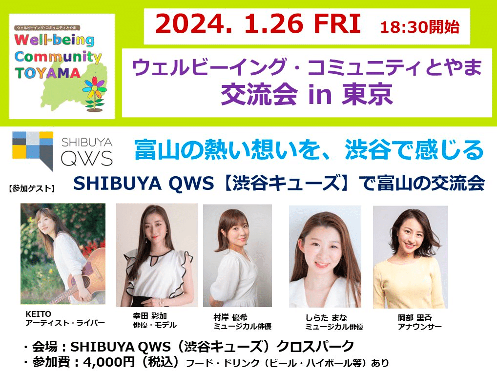 ウェルビーイングを通じた交流を創出し、関係人口の拡大につなげるコミュニティ「ウェルビーイング・コミュニティとやま」の交流が東京で開催されます。初めての東京開催イベントですので、ぜひお気軽にご参加ください。