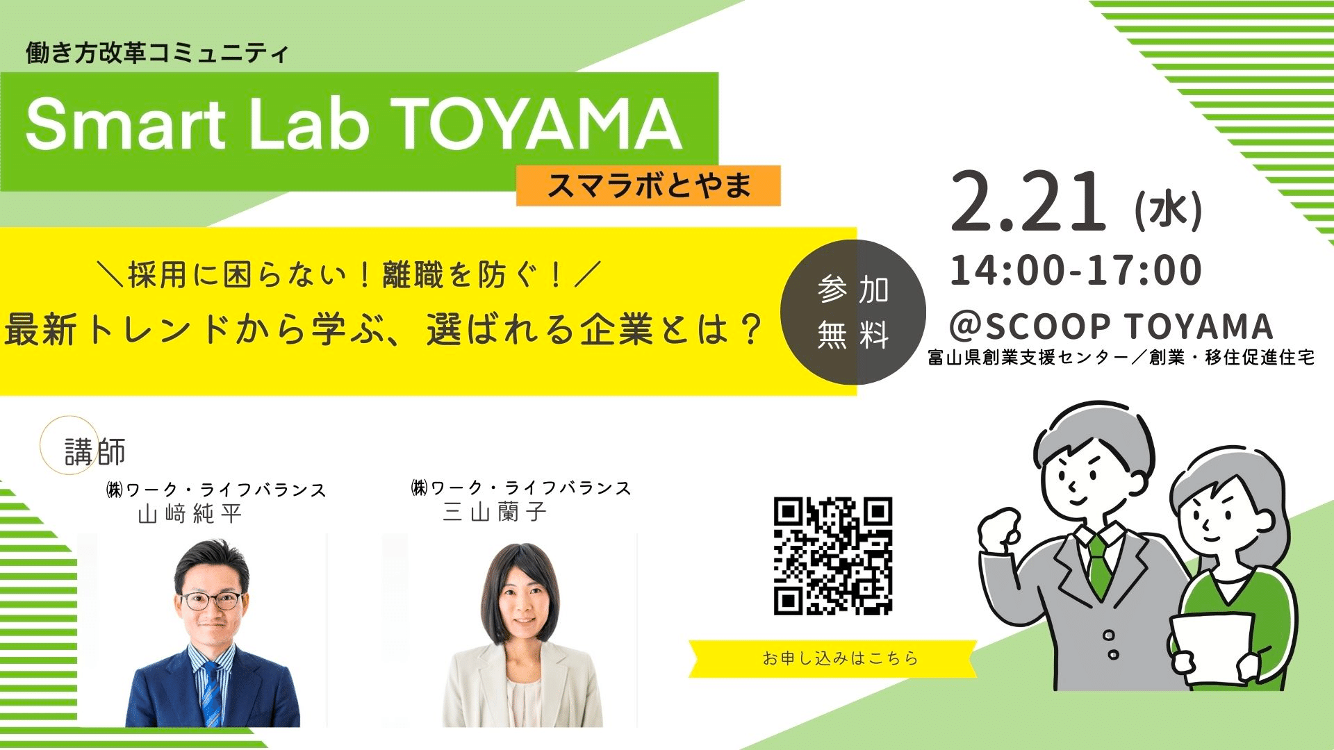 働き方改革コミュニティ「Smart Lab TOYAMA(通称:スマラボとやま)」の令和5年度第10回目のイベントを、2月21日(水)にSCOOP TOYAMAで開催します。